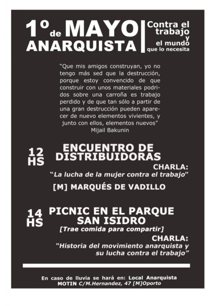 La segunda es que esa parte de los ‘’excluidos’’ que quedan fuera del trabajo asalariado, rompan con los códigos y comportamientos de la democracia y del chantaje del mercado laboral (el paro no es si no una aterradora advertencia de lo que pasa si no te dejas explotar cuando patronal y estado quieran y te den oportunidad y no te sometes puntualmente a sus exigencias) y traten de buscar vínculos con esos “incluidos” que sí tienen un trabajo asalariado y están ya más que hartos de aguantar día tras día la humillación y la miseria, y se rebelen ante sus condiciones de vida. Pero no una rebelión para tener, sino para ser; no para salir de la miseria sino porque la vida ya es totalmente inútil y sólo puede ser auténtica si tomamos las riendas en nuestras manos.