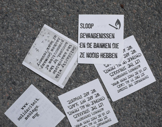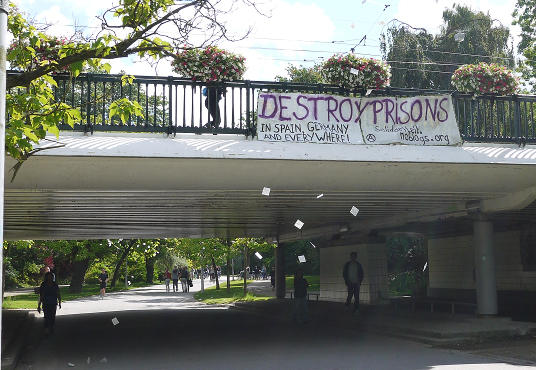 Después de que las pancartas fueron colgadas fueron lanzados por los aires volantes con mensajes como: «Destruye todas las prisiones y el mundo que los necesita, hasta que todxs somos libres», etc.