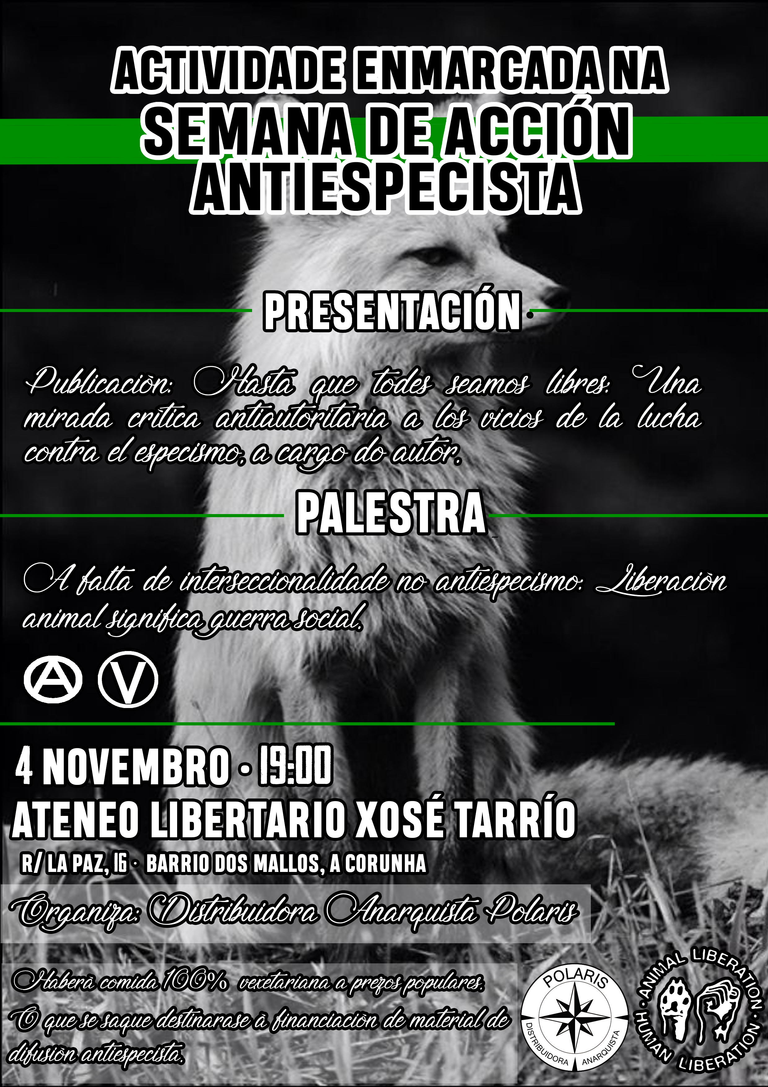 El próximo 4 de noviembre, en el contexto de la Semana internacional de acción antiespecista, tendrá lugar en el Ateneo Libertario Xosé Tarrío un evento en el que se presentará la publicación “Hasta que todes seamos libres: Una mirada crítica antiautoritaria a los vicios de la lucha contra él especismo“, a cargo de su autor, y posteriormente tendrá lugar una charla que bajo el título “La falta de interseccionalidad en el antiespecismo: Liberación animal significa guerra social” profundizará más en la temática de dicha publicación, hablando de las consecuencias y problemas que acarrea la falta de un posicionamiento político claro contra la opresión dentro de los movimientos animalistas (la mercantilización del veganismo, la tolerancia hacia la presencia de individuos y grupos xenófobos, racistas o nazis en estos movimientos, la colaboración con las fuerzas policiales, la proliferación de actitudes machistas o LGTBIfóbicas…). Habrá comida 100% vegetariana a precios populares para llenar la barriga y seguir con las conversaciones de manera más informal. También habrá espacio para distris. Todo lo recaudado con el evento será destinado a la edición de material antiespecista.