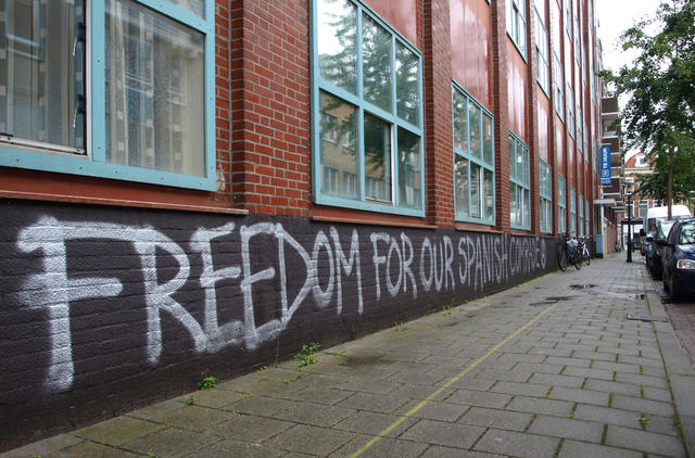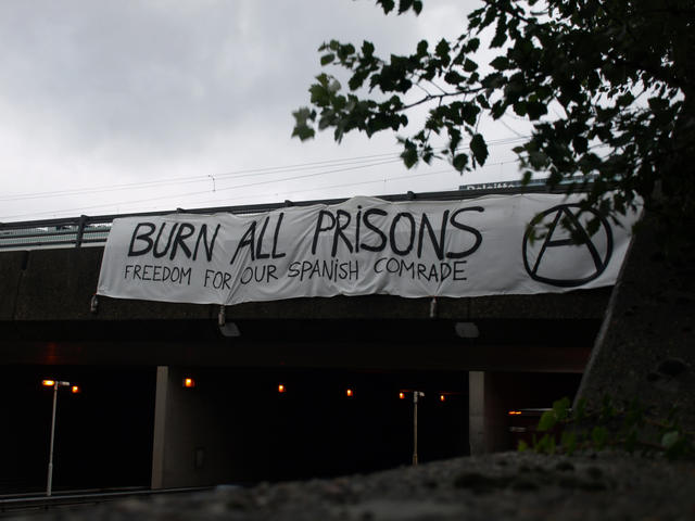 En solidaridad pintamos con spray «LIBERTAD PARA NUESTRA COMPAÑERA ESPAÑOLA» en la pared del edifico de la embajada española en La Haya, Países Bajos y colocamos pegamento en los cerrojos. Esa misma mañana, durante la hora punta colgamos un lienzo por encima de la carretera donde se leía «FUEGO A TODAS LAS PRISIONES, LIBERTAD A NUESTRA COMPAÑERA ESPAÑOLA».