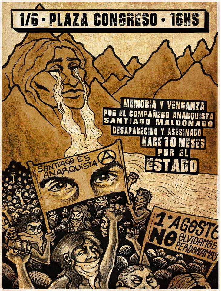 A 10 meses de la desaparición y muerte del compañero anarquista Santiago Maldonado, Convocamos el 1/6 en Plaza Congreso a las 16 hrs, a invocar la memoria colectiva de su persona y de su lucha. No estamos para pedirle justicia al Estado burgués, estamos buscando venganza.