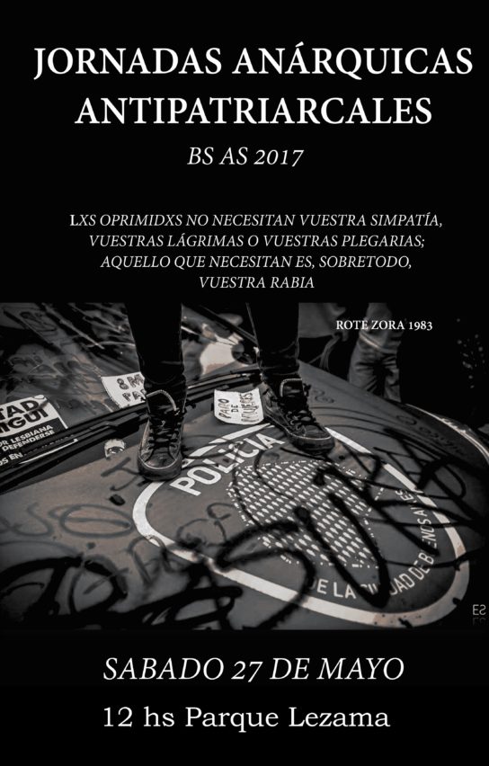 Enfrentadxs a esta realidad y todo lo que ella representa impulsamos las jornadas anarquicas antipatriarcales , a realizarse el 27 de mayo en el parque lezama, como momento de encuentro, debates y tensiones contra la autoridad y por lo tanto el patriarcado, entendiendo y reafirmando que su destrucción es esencial en esta lucha contra toda forma de dominación.