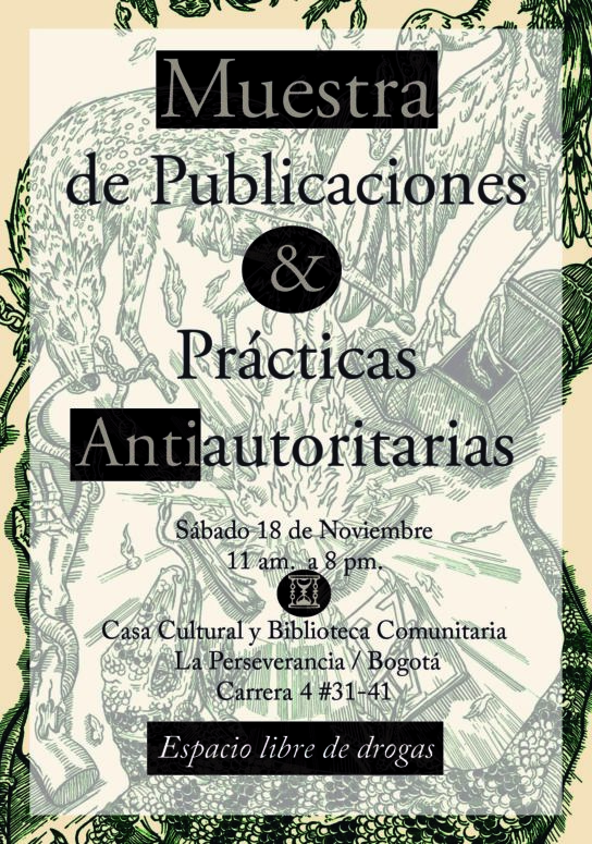 Al rededor de los carbones llameantes, con ojos brillantes y profundos, espíritus saciadxs del sabor de los cuerpos civilizados, se reúnen hostiles a quienes dominan y obedecen. Aquí nos encontramos. Invitando a lxs seres ingobernables, desesperadamente astiadxs de los límites y de la pasividad. Entre música, teatro, comidas, libros, fanzines y calcomanías, les convidamos a esta muestra de publicaciones y practicas antiautoritarias. A pesar de lxs presxs, lxs muertxs, lxs fugadxs y las distancias, hay puestos cerca al fuego para todxs aquellxs que quieran participar.