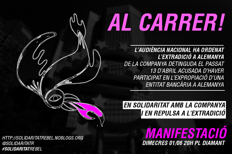 A pesar de haberse difundido una convocatoria llamando a manifestarse al día siguiente de notificarse la extradición, y debido a la lucha abierta por la recuperación del Banc Expropiat, hemos decidido posponer la movilización a la semana siguiente, para el próximo miércoles 01 de junio, a las 20:00 hrs. en la plaza diamante. Estos días de lucha, de resistencia, y de dignidad ante la brutalidad con la que la policía está defendiendo los intereses de los especuladores, intentando usurpar este espacio construido por el barrio, sentimos a la compañera encarcelada más cerca que nunca. Sabemos que ella sería una más de tantas, defendiendo el Banc Expropiat por todos los medios en las calles de Gràcia, donde ella misma ha vivido durante años.