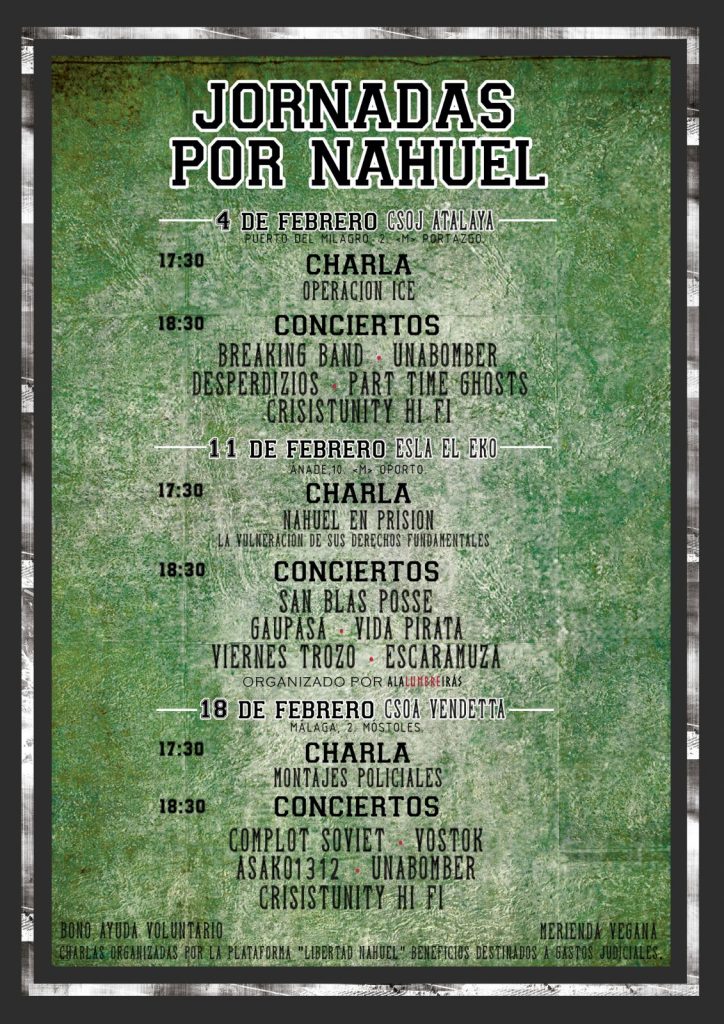 DESDE LA PLATAFORMA NAHUEL LIBERTAD OS INVITAMOS A TODAS Y A TODOS PARTICIPAR EN LAS “JORNADAS POR NAHUEL” EN FEBRERO DE 2017!! Este febrero asistiremos a las jornadas por Nahuel, serán tres días en los que tendrá lugar una charla en torno a la Operación Ice seguida de una serie de conciertos. Habrá merienda vegana y todos los beneficios serán para las represaliadas de Straight Edge Madrid.