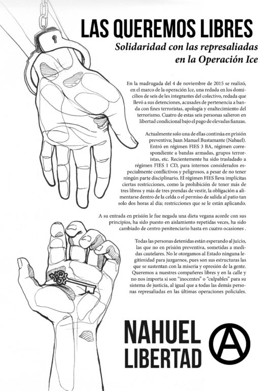 concentracion-544x769En unos días llegará Noviembre y se cumplirá un año desde que la policía irrumpió en casa de algunxs compañerxs para llevárselxs detenidxs. En unos días nuestro compañero Nahuel cumplirá un año encerrado en diferentes cárceles del Estado Español. Es por esto que queremos intensificar nuestro apoyo y difusión en estos próximos meses.