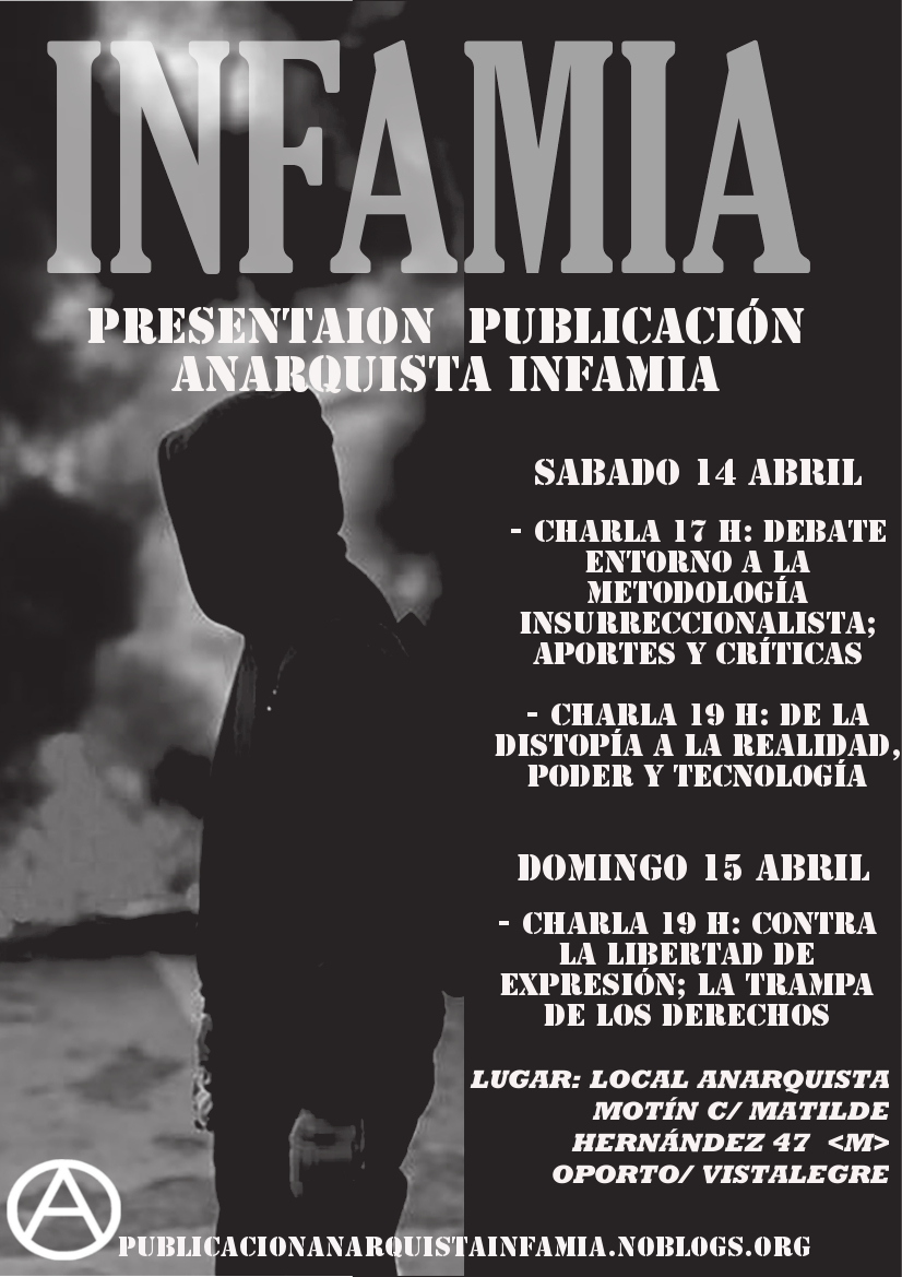 Los días sábado y domingo 14 y 15 de Abril tendrá lugar en el local anarquista Motín unas jornadas de presentación de la nueva publicación anarquista «infamia».
