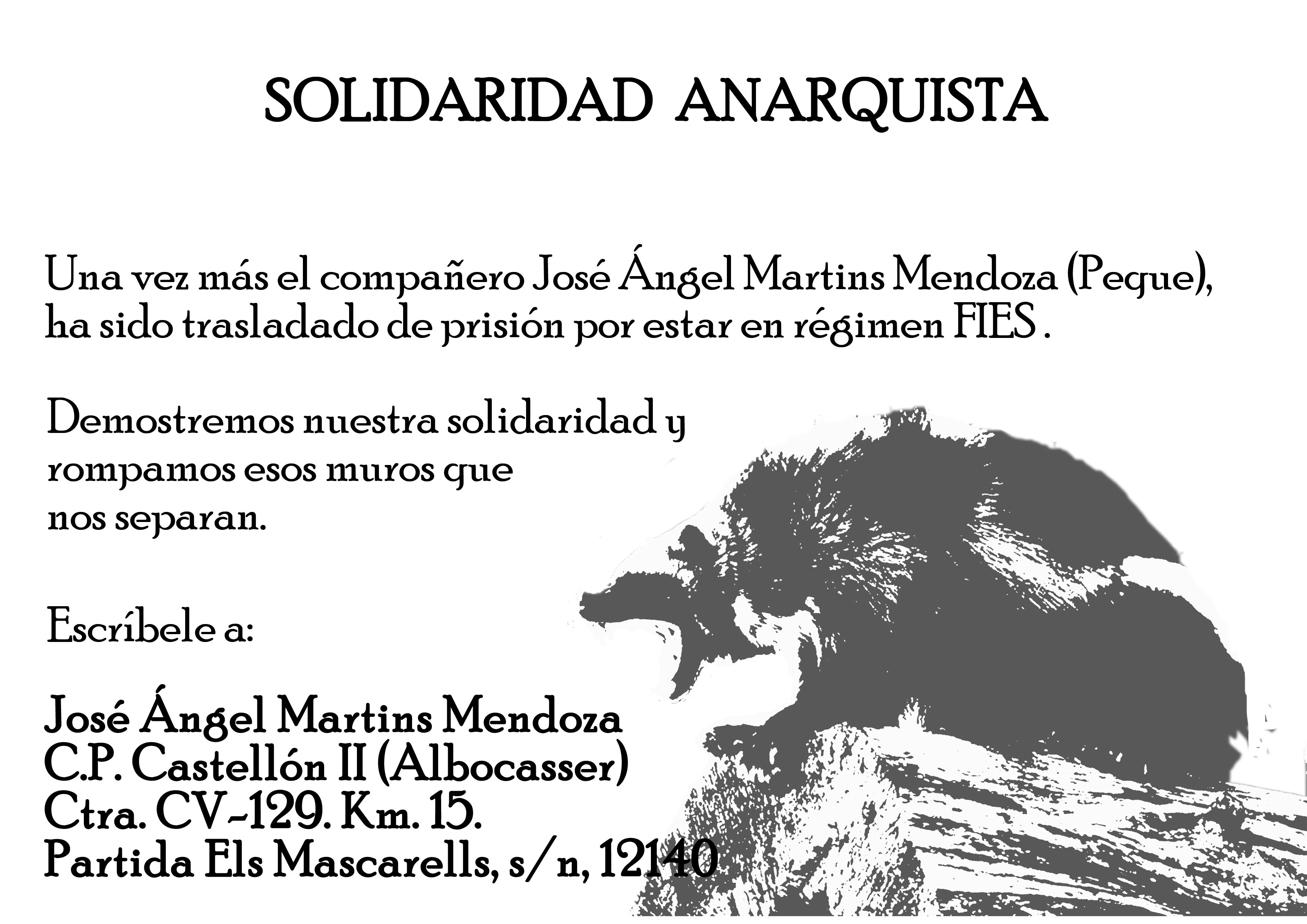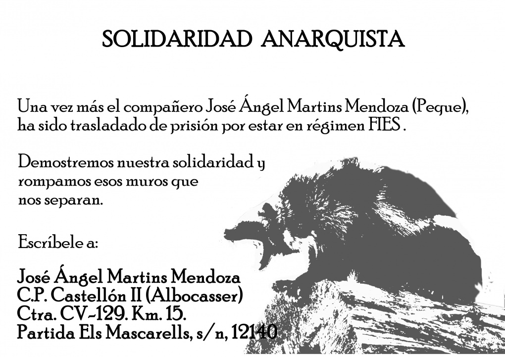 El compañero José Ángel Martins Mendoza (Peque), fue trasladado el día 18 de marzo a la prisión de Castellón II.