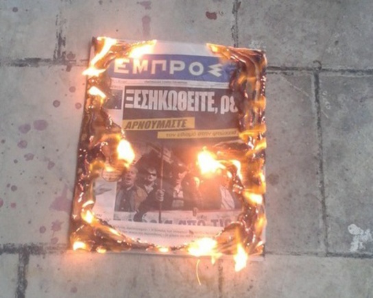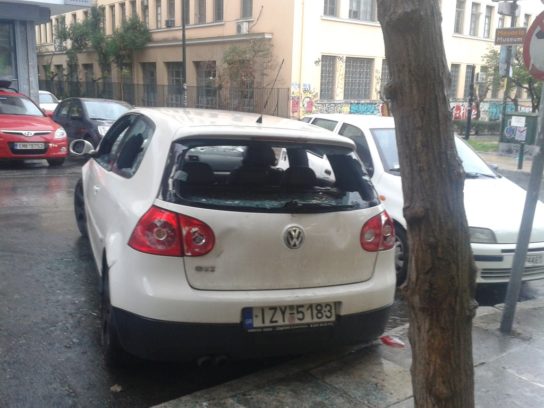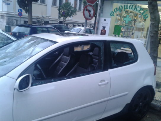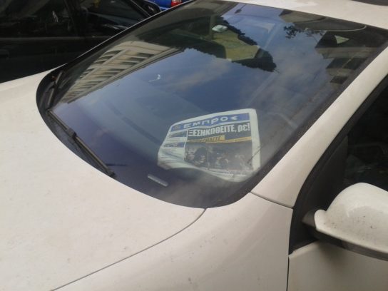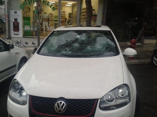 Al mediodía del miércoles 9 de noviembre del 2016, en la intersección de las calles Tositsa y Bouboulinas en Exarchia se localizó un coche Volkswagen blanco con matrículas IZY 5183 que por dentro del parabrisas delantero mostraba el periódico nazi Empros. Un grupo de compañerxs se movilizó rápido y reventó el vehículo.