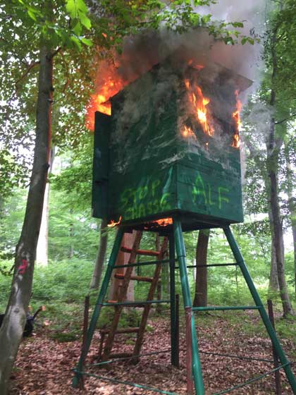 «4 TORRES DE CAZA FUERON DESTRUIDAS Y QUEMADAS EN FRANCIA – JULIO EL AÑO 2016. En la región noreste de Francia, Alsacia-Lorena, 4 torres de caza se han quemado y destruido por activistas locales del ALF. Pintada muestra los indicios del ALF y el mensaje “A Parar la Caza” en francés y alemán. Estamos emocionados, es sólo el principio. Este verano será activa. Únanse a las acciones «.