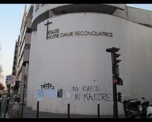 Desde el principio se pintaron paredes. La primera en inaugurar la marcha, “Ni Dios Ni Amo” (seguida por “Ni policías ni profetas”), se mostraron las ideas anarquistas en su totalidad, sin la mutilación populista. Porque si, las ideas anarquistas no están adaptadas al gusto de la gente, y los barrios pobres no están a salvo de la peste religiosa (ni de las ideas anarquistas anti-teístas las cuales se han expresado desde hace 150 años). Otra pintada decía “Si Dios existiese tendríamos que apalearlo” porque no, para nosotrxs Bakunin (y otrxs) no se utilizan para la publicación de éxitos ni para rellenar estanterías. Mientras que algunxs consideran las ideas anti-teístas un lujo reservado a unos pocos debates internos en los ambientes “iluminados”, si tenemos en cuenta que lxs oprimidxs a menudo forjan sus propias formas de autoridad en si mismos (mafia, religión, espíritu de clan, machismo) por debajo de las formas de autoridad que afectan a todxs en mayor o menor grado, nosotrxs anarquistas estamos y siempre estaremos en contra de toda autoridad.