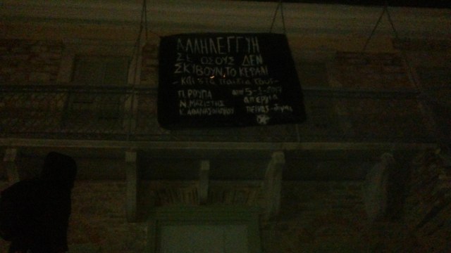 Foto: Lienzo en Syros «Solidaridad con lxs que no inclinan la cabeza – y a sus hijos – P. Roupa, N. Maziotis, K. Athanasopoulou«