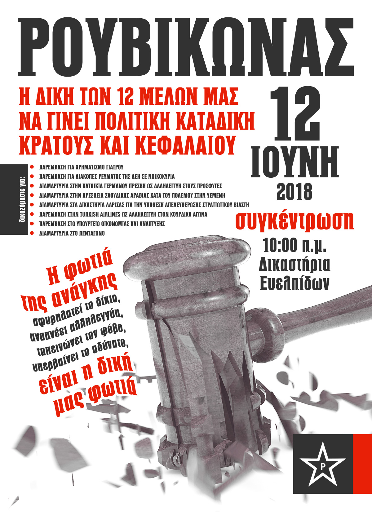 Una gran reunión de apoyo tendrá lugar frente al Tribunal Evelpidon en Atenas el martes 12 de junio a las 10.00. El objetivo: contestar masivamente el proceso de 12 activistas del célebre grupo anarquista Rouvikonas. Un grupo cada vez más popular en Grecia en consecuencia de sus acciones ejemplares contra todas las formas de opresión.