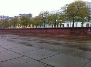 En la noche entre el 4 y 5 de noviembre, unos saludos solidarios fueron pintados en un muro del puerto de Hamburgo, como para permitir que los barcos de contenedores y transbordadores por alguna vez aporten algo de valor a los mares.