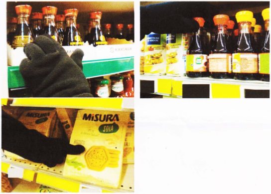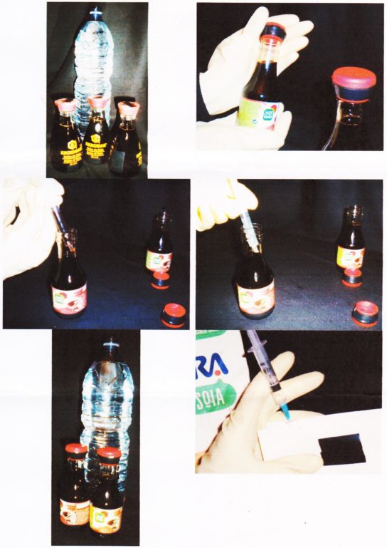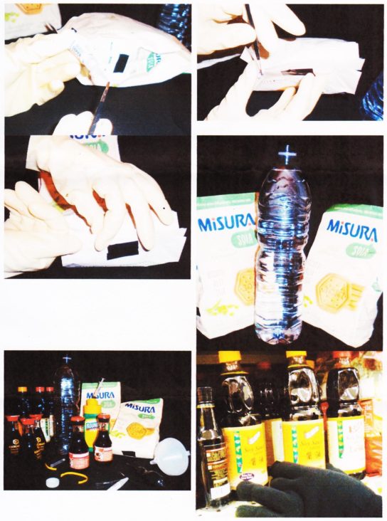 El veneno usado es Roundup de Monsanto, una botella de líquido concentrado para 560 metros cuadrados. Nuestro kit: Una jeringa, un embudo, una botella de agua de 1.5 litros, unas pinzas, un destornillador, un pincel de punta fina y pegamento. Los productos envenenados: Galletas de soja Misura, salsa de soja Suzi Wan, salsa de soja Kikkoman, salsa de soja Save (en las versiones “tradicional” y “estilo japonés”).