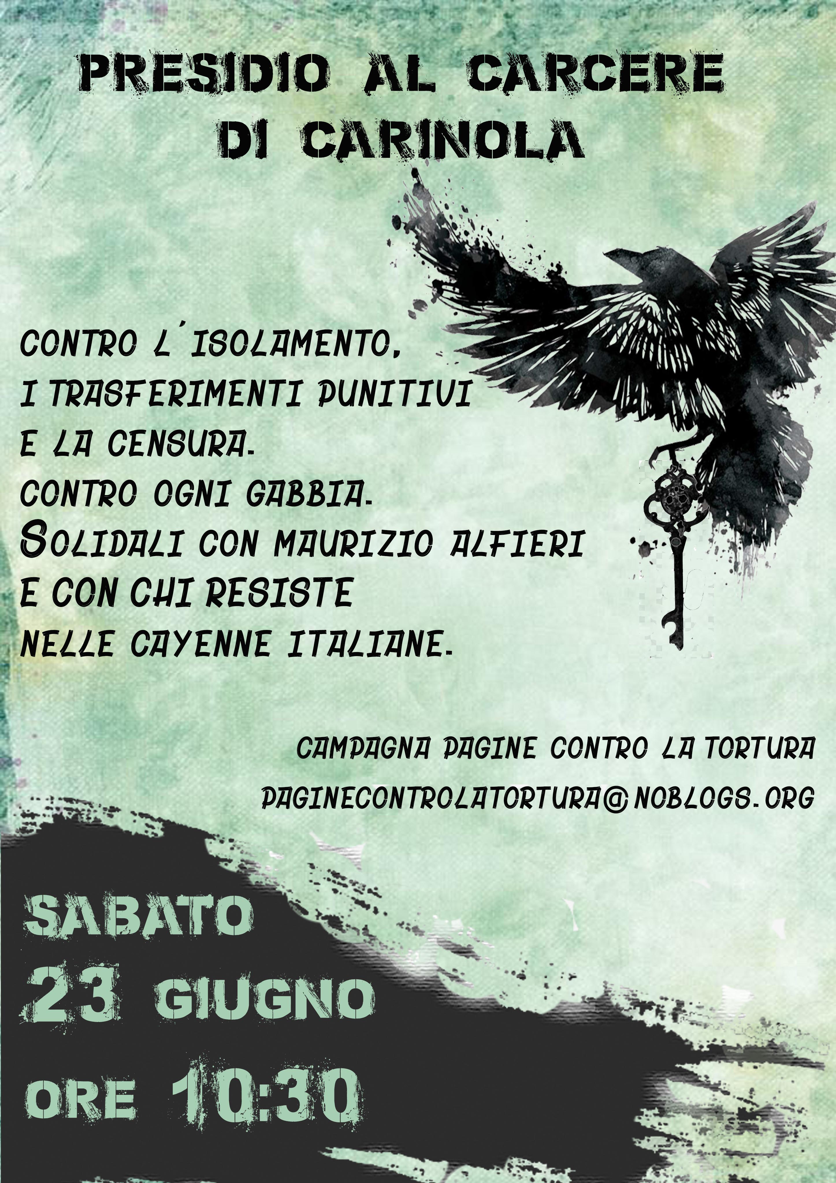 El sábado 23 de junio estaremos fuera de la prisión de Carinola contra el aislamiento, la censura y las transferencias punitivas, y para apoyar y dar fuerza a los muchos Maurizios que están detenidos en las cárceles italianas.
