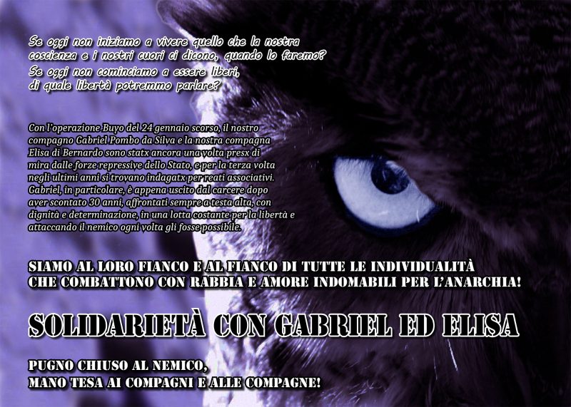 Con la última operación Buyo, del 24 de enero, nuestro compañero Gabriel Pombo da Silva y nuestra compañera Elisa di Bernardo, una vez más han sido blanco de las fuerzas represivas del Estado y por tercera vez en los últimos años se les investigó por asociación criminal. Gabriel, en particular, acaba de ser liberado de la prisión después de cumplir los 30 años, por ir siempre de frente, con dignidad y determinación, en una lucha constante por la libertad y atacar al enemigo cada vez que tenía la posibilidad.