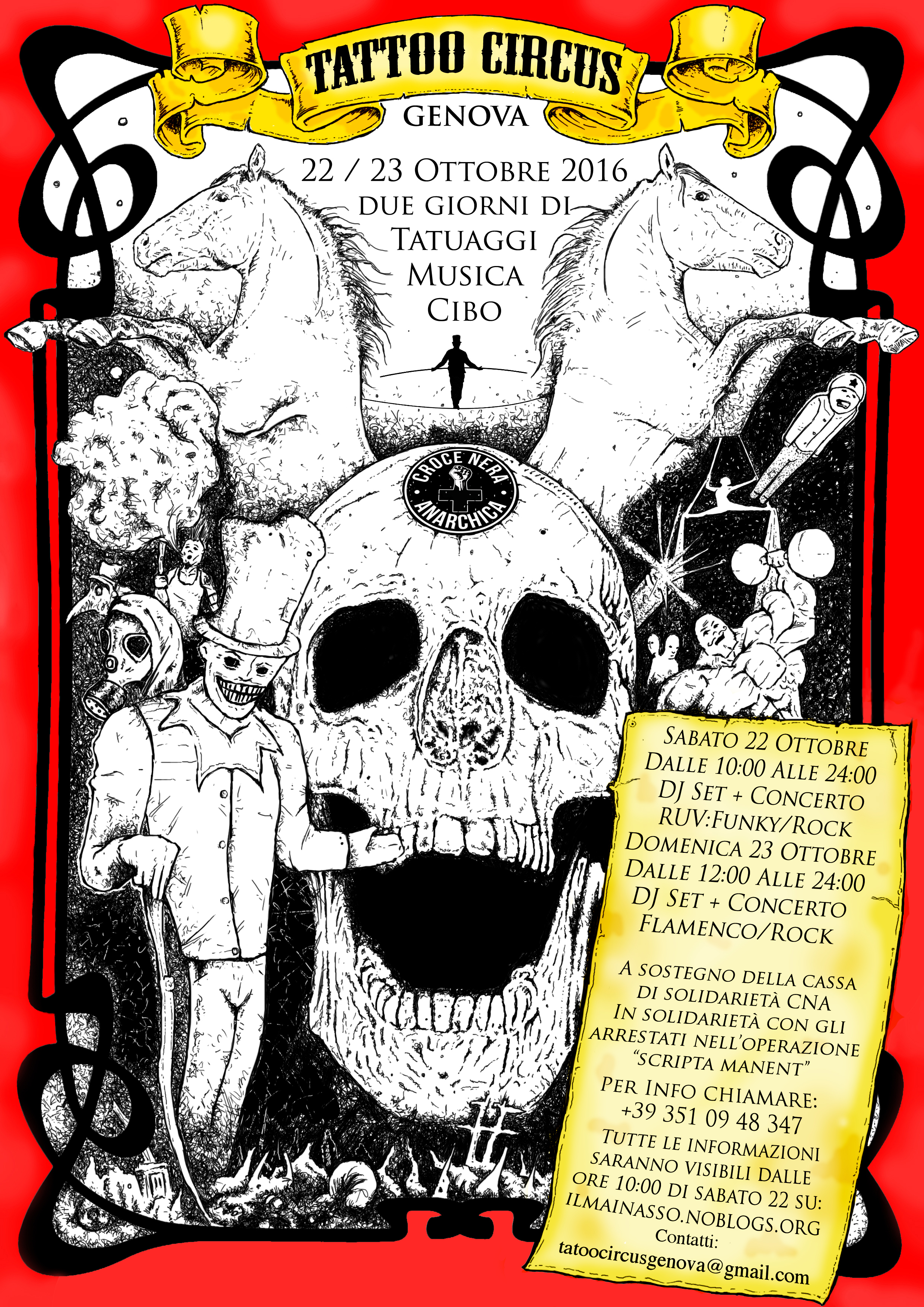 ITALIA: TATTO CIRCUS: EN BENEFICIO DE LA CNA Y EN SOLIDARIDAD CON LXS ARRESTADXS EN LA “OPERACIÓN SCRIPTA MANENT”
