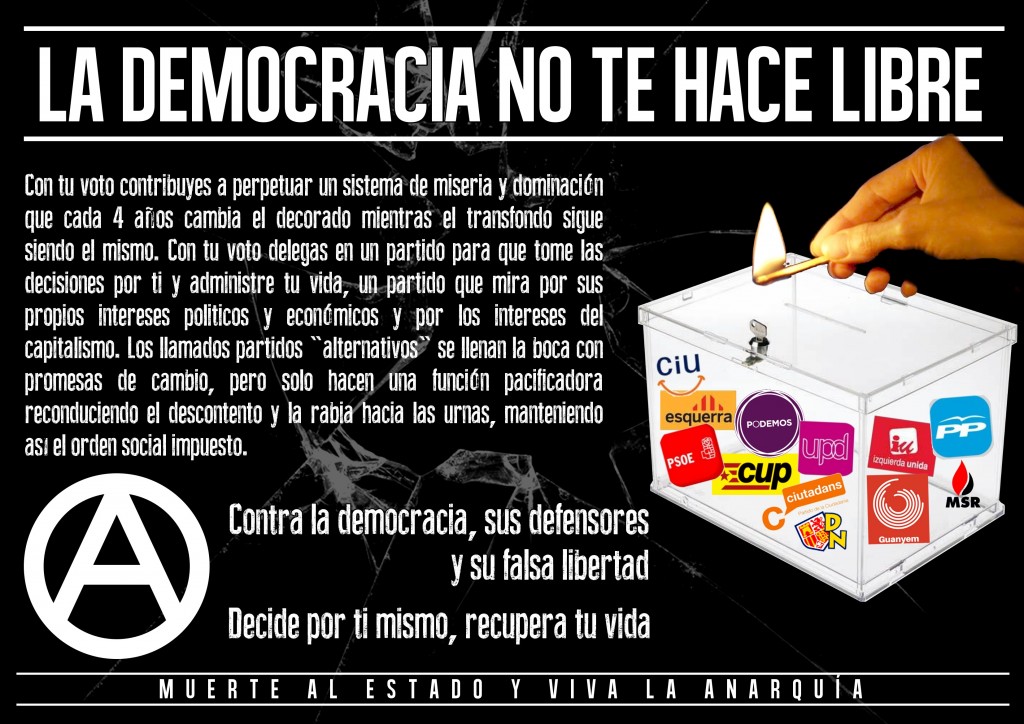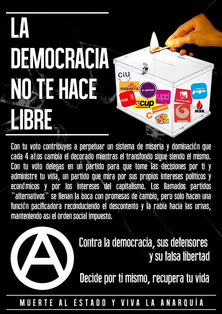 Es por todo esto , que hacemos un llamamiento a una campaña anti-electoral, llamamos a sabotear el proceso electoral y a quebrar la democracia y sus valores.