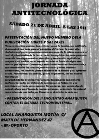 El sábado 21 de Abril a las 19h tendrá lugar en el Local Anarquista Motín la presentación de la publicación contra la máquina «Libres y salvajes» y del II Encuentro anarquista contra el sistema tecnoindustrial.