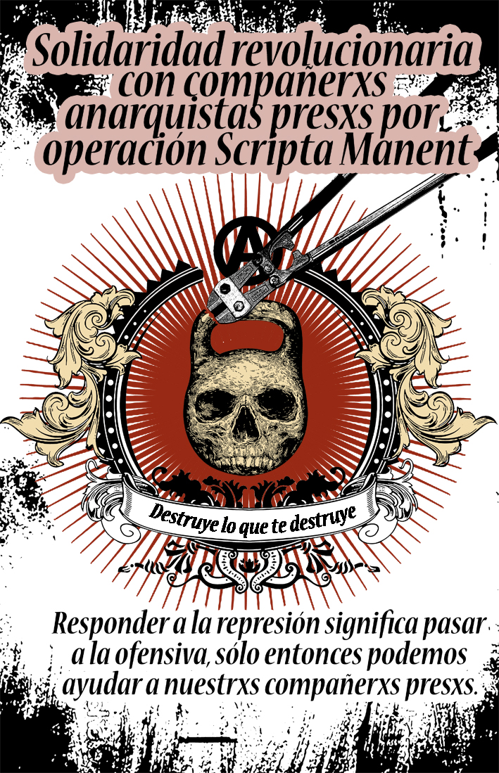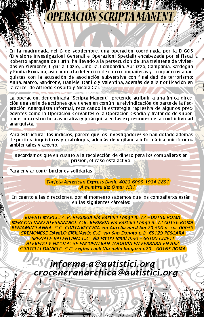 La operación, denominada “Scripta Manent”, pretende atribuir a una única dirección una serie de acciones que tienen en común la reivindicación de parte de la Federación Anarquista Informal, recalcando la estrategia represiva de algunos precedentes como la Operación Cervantes o la Operación Osadía y tratando de superponer una estructura asociativa y jerárquica en las expresiones de la conflictividad anarquista.
