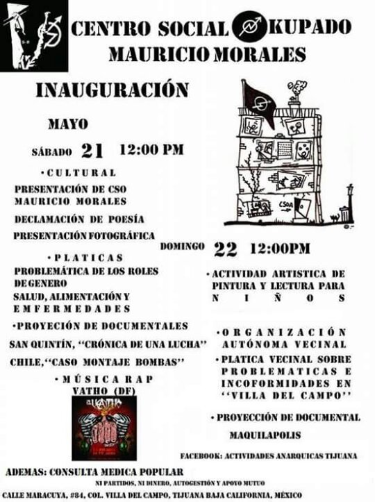 El próximo 21 y 22 de mayo algunos individuos anarquistas inauguraremos el Centro Social Okupado Mauricio Morales, un lugar donde se realizaran e incitaran a realizarTalleres, charlas, proyección de documentales y películas, presentación de libros, revistas ácratas, fanzines, exposiciones de fotografía y pintura, presentación de textos y poesía, entre otras actividades.