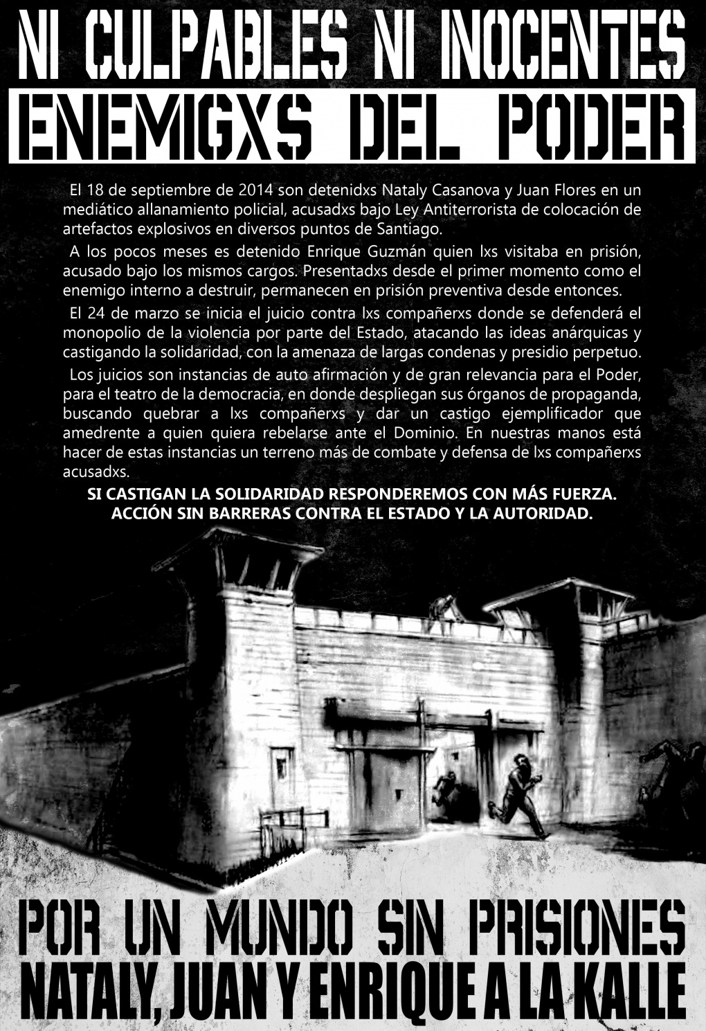 El 18 de septiembre de 2014 son detenidxs Nataly Casanova y Juan Flores en un mediático allanamiento policial, acusadxs bajo Ley Antiterrorista de colocación de artefactos explosivos en diversos puntos de Santiago.