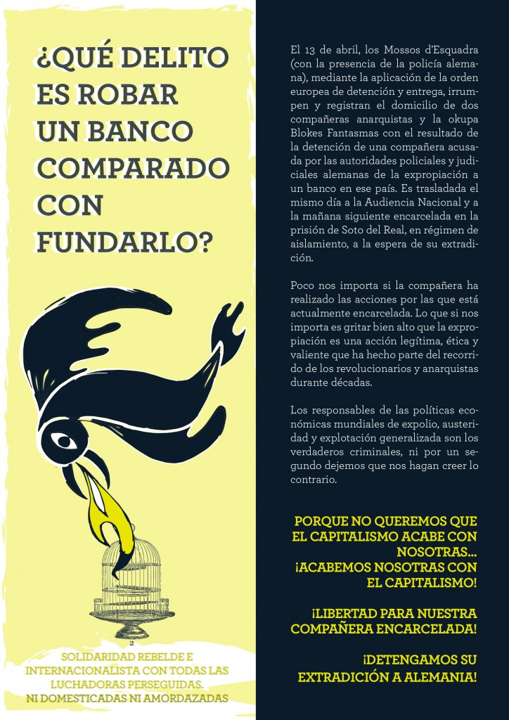 El 13 de abril, los Mossos d’Esquadra (con la presencia de la policía alemana), mediante la aplicación de la orden europea de detención y entrega, irrumpen y registran el domicilio de dos compañeras anarquistas y la okupa Blokes Fantasmas con el resultado de la detención de una compañera acusada por las autoridades policiales y judiciales alemanas de la expropiación a un banco en ese país. Es trasladada el mismo día a la Audiencia Nacional y a la mañana siguiente encarcelada en la prisión de Soto del Real, en régimen de aislamiento, a la espera de su extradición.