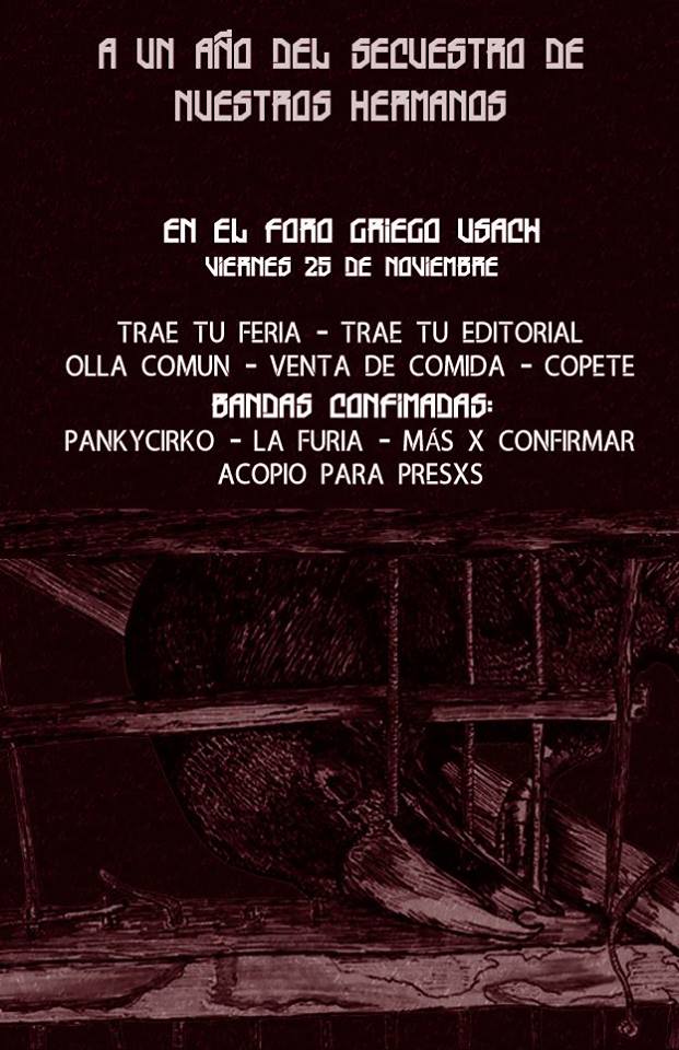 Ya a un año del secuestro, seguimos posicionados en el conflicto solidarizando con cada presx en el mundo, de Chile a Grecia y de Grecia a Chile, del mundo al mundo, la solidaridad y el ataque ha de tener carácter internacional.