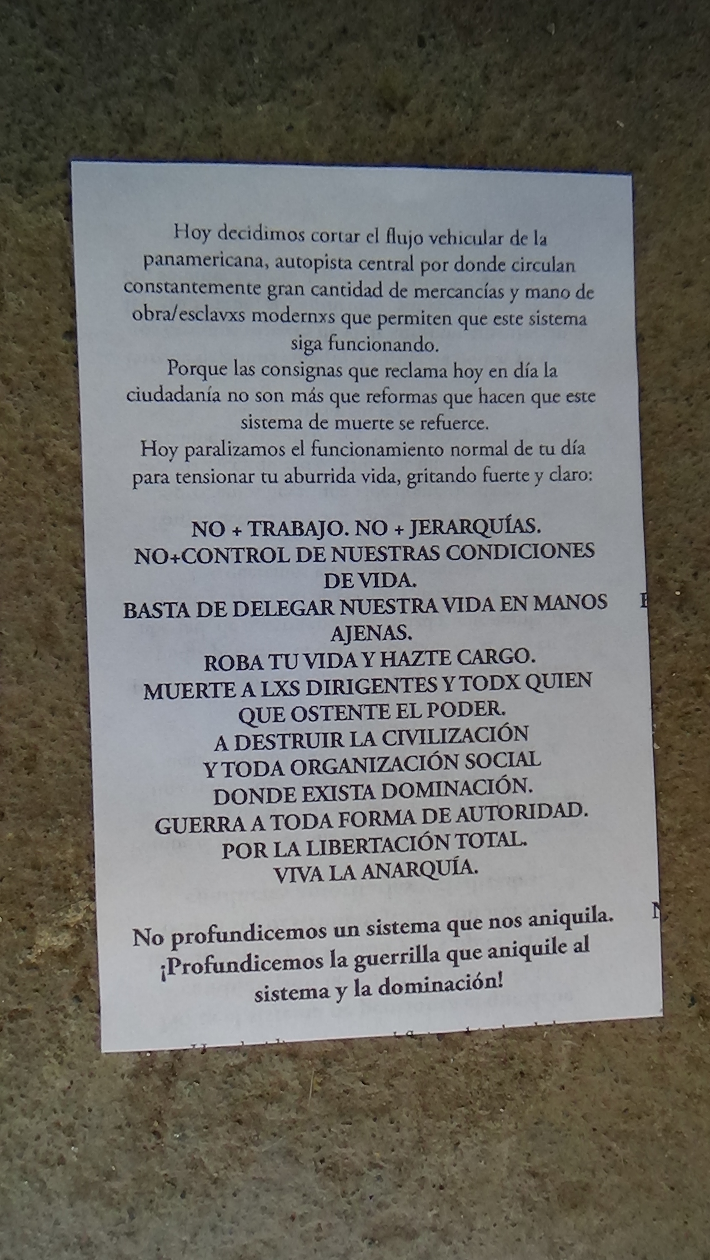 La madrugada del día Viernes 04 de Nov, aprovechando la coyuntura actual de paro nacional y los ánimos revoltosos que se veían venir para ese día, y con el fin de visibilizar nuestros planteamientos antagónicos al poder, alejándonos de consignas ciudadanas y reformistas, y de demandas que sólo fortalecen el sistema imperante, es que nos agrupamos tempranamente para cortar el flujo vehicular de la autopista consecionada panamericana, levantando barricadas y esparciendo panfletos por el lugar, además de un lienzo que se colgó en una pasarela cercana.