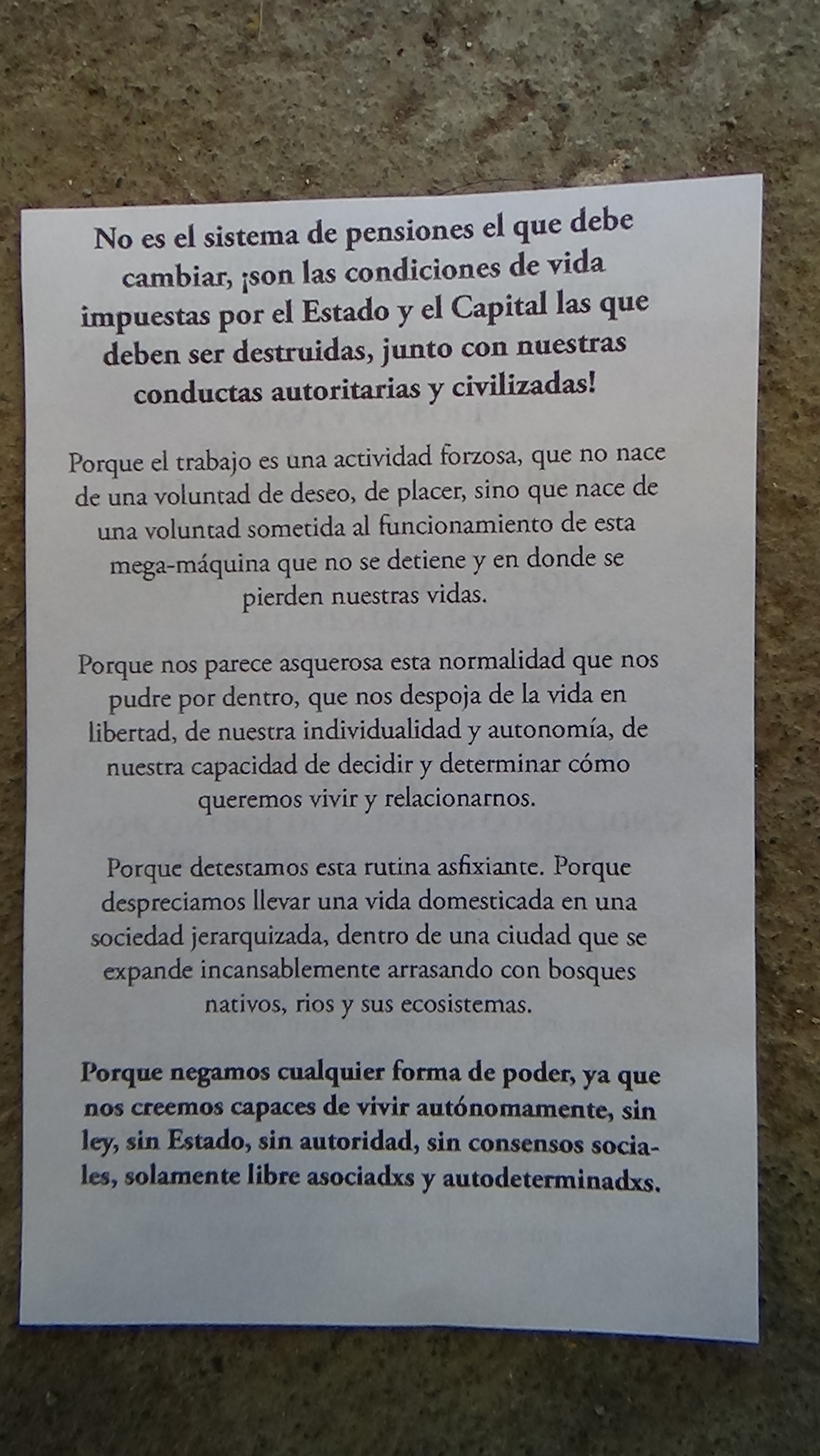 No es el sistema de pensiones que debe de cambiar ¡son las condiciones de vida impuestas por el Estado y el Capital las que deben ser destruidas, juntas con nuestras conductas autoritarias y civilizadas!