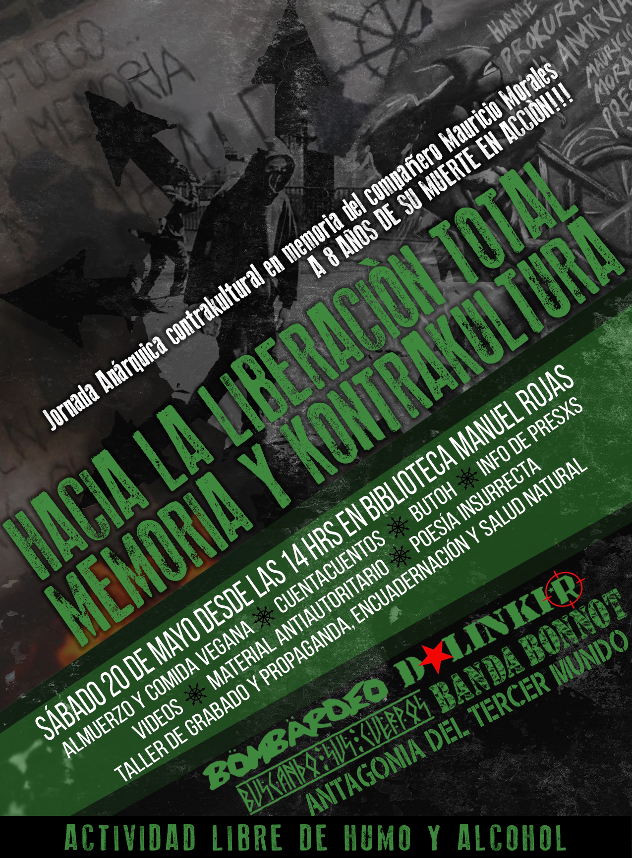 Compañerxs lxs invitamos a hacerse parte de la jornada kontrakultural a realizarse el día 20 de mayo desde las 14 hrs en la Biblioteca Manuel Rojas, en memoria del compañero Mauricio Morales, el “Punki Mauri” a 8 años de su muerte en acción.