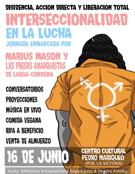 Les invitamos a la actividad enmarcada en el 11 de Junio- Día internacional en solidaridad con Marius Mason y con lxs presxs anarquistas de larga condena, en la cual se tensionarán temas como la disidencia dentro/fuera de espacios anarquistas, antiespecismo y anticarcelario, tratando de visibilizar la situación que afronta Marius Mason y todxs lxs compañerxs encarceladxs en distintos territorios.