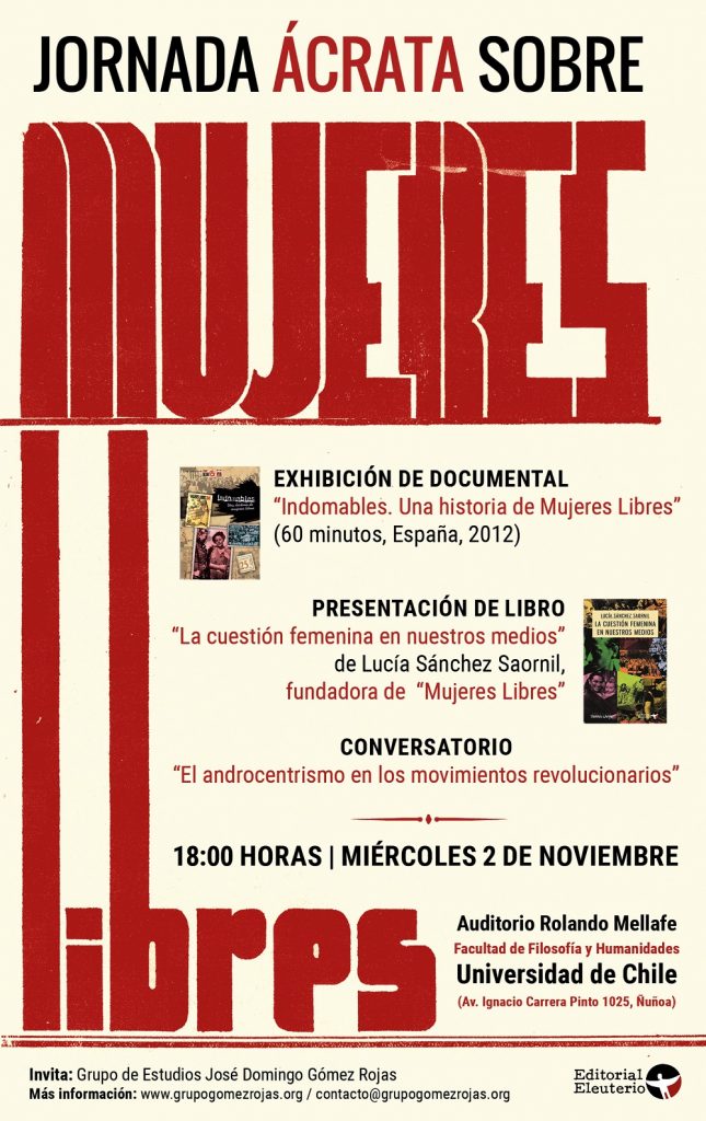 A 80 años del surgimiento de «Mujeres Libres» en el seno del movimiento anarquista español, Grupo de Estudios José Domingo Gómez Rojas invita a la Jornada Ácrata sobre Mujeres Libres para recordar, analizar y discutir los postulados, proyectos y conflictos que giraron en torno a esta organización anarquista y femenina.