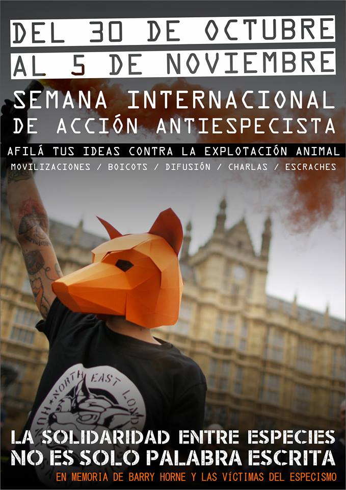 A través de redes sociales se ha lanzado una convocatoria internacional para una semana de acción contra el especismo, entre el 30 de octubre y el 5 de noviembre. Se anima a realizar todo tipo de acciones, desde propaganda en la calle (pintadas, carteles, distribución de panfletos…) hasta charlas y debates en vuestros espacios de encuentro y auto-organización, acciones diversas contra negocios especistas con las herramientas que cada cual considere apropiadas, o movilizaciones y manifestaciones. Que cada cual se organice como le convenga y agite contra todas las jaulas. En memoria de Barry Horne y de todas las víctimas humanas y no-humanas del especismo y de la dominación.