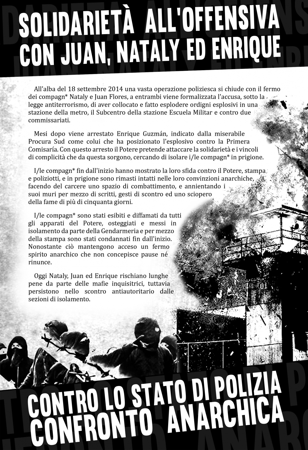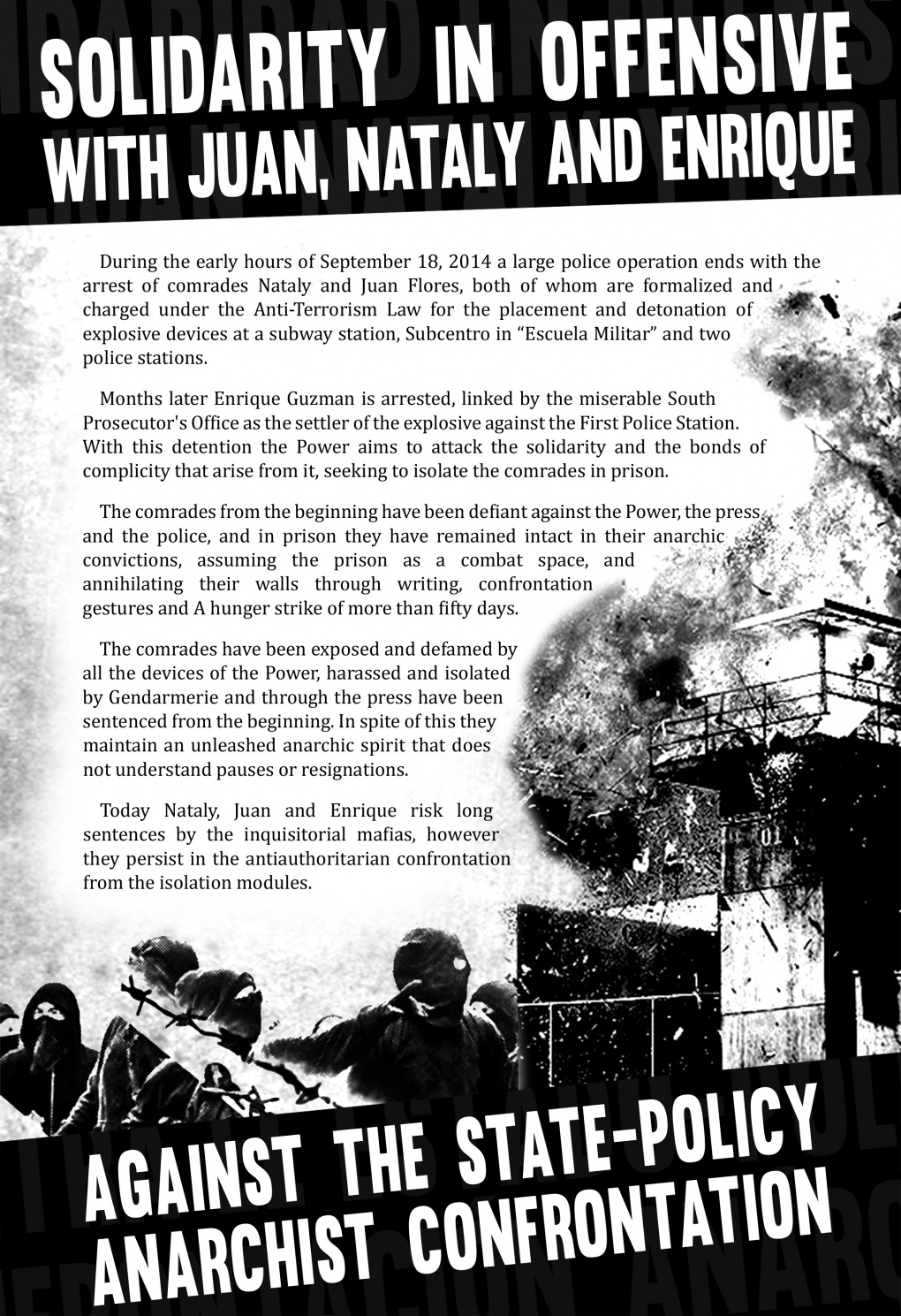 Today, Nataly, Juan and Enrique risk long sentences by the inquisatorial mafias, however they persist in the antiauthoritarian confrontation from the isolation modules.