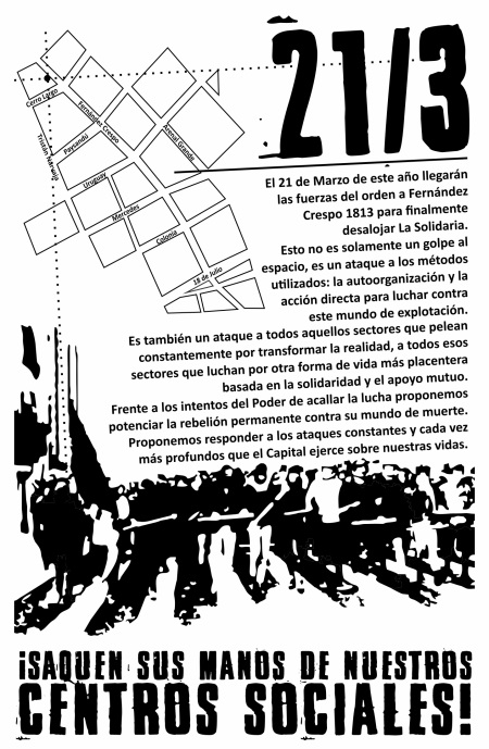 El 21 de Marzo de este año llegarán las fuerzas del orden a Fernández Crespo 1813 para finalmente desalojar La Solidaria. Esto no es solamente un golpe al espacio, es un ataque a los métodos utiizados: la autoorganización y la acción directa para luchar contra este mundo de explotación.Es también un ataque a todos aquellos sectores que pelean constantemente por transformar la realidad, a todos esos sectores que luchan por otra forma de vida más placentera basada en la solidaridad y el apoyo mutuo. Frente a los intentos del Poder de acallar la lucha proponemos potenciar la rebelión permanente contra su mundo de muerte. Proponemos responder a los ataques constantes y cada vez más profundos que el Capital ejerce sobre nuestras vidas.